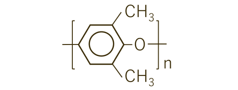 2,6キシレノールの酸化カップリング重合により非晶質PPEを製造。この単体では射出成形に不向きであるため、他のプラスチックとのポリマーアロイを行なっている。