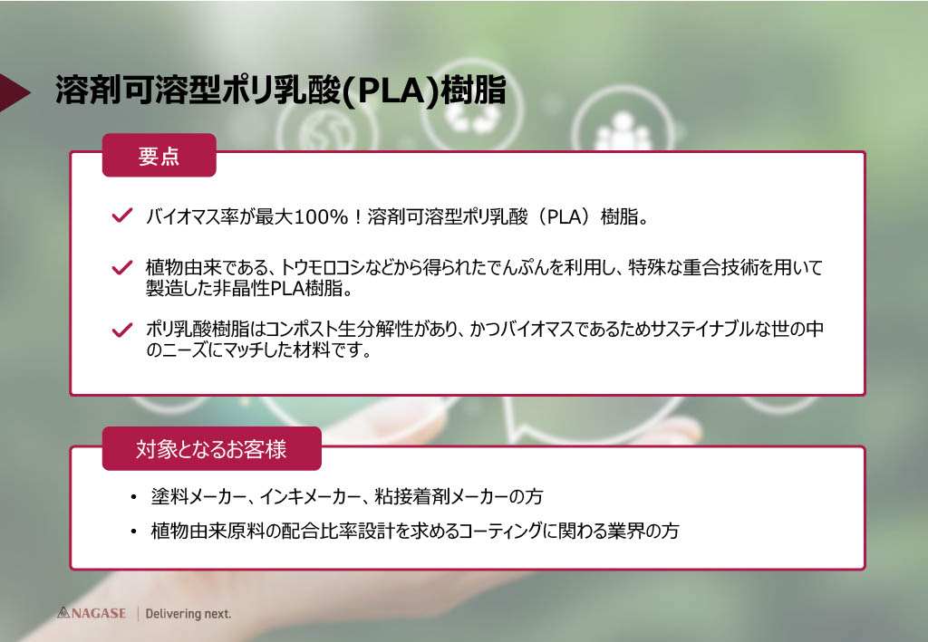 バイオマス率が最大100%!「溶剤可溶型PLA」長瀬産業PLA詳細資料ダウンロード