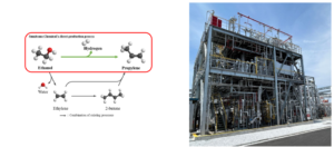 住友化学が開発を進めている本プロセスの特徴は、エタノールを原料としてプロピレンを直接製造することです。エチレンなどを経由せず、単一プロセスで目的のプロピレンを生産することで、コスト削減が期待されます。もう一つの利点は、副産物として水素が生成されることです。バイオエタノールを原料として使用する場合、バイオ由来の水素を得ることができます。