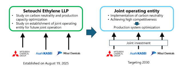旭化成、三井化学、三菱ケミカルの3社は、西日本に保有する計2つのエチレン製造施設に関し、2030年をターゲットとしたカーボンニュートラルの実現と生産能力の最適化を図るため、有限責任事業組合(LLP)を設立し、関連検討を加速します。