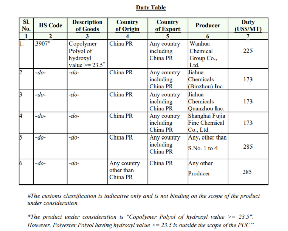 この関税は、「水酸基価 >=23.5 のコポリマーポリオール」(HSコード 3907 2910 および 3907 2990)の輸入に適用されます。この化学品は、主にマットレスなどの用途の軟質フォームの製造に使用されます。DGTRは、同じグレードのポリエステルポリオールはこの措置から除外されることを明確にしました。