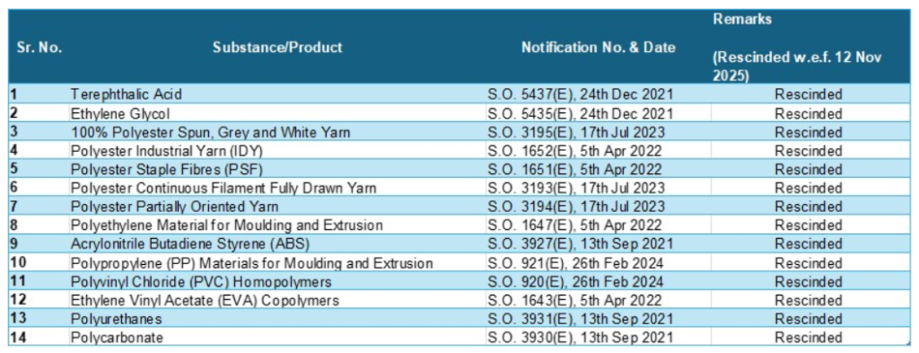 撤回されたQCOは、化学品、プラスチック、繊維のバリューチェーン全体で広く使用されている、様々な重要なポリマーおよび繊維中間体、材料を対象としていました。これには、テレフタル酸(PTA)、エチレングリコール(EG)、ポリエステル糸および繊維、ポリプロピレン(PP)、ポリエチレン(PE)、ポリ塩化ビニル(PVC)、アクリロニトリル・ブタジエン・スチレン(ABS)、ポリカーボネート(PC)、エチレン・ビニル・アセテート(EVA)共重合体、およびポリウレタン(PU)が含まれます。